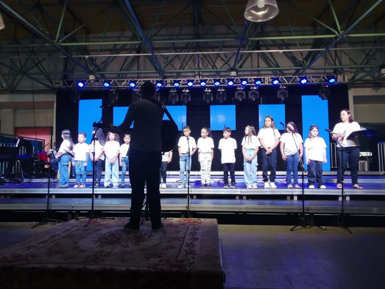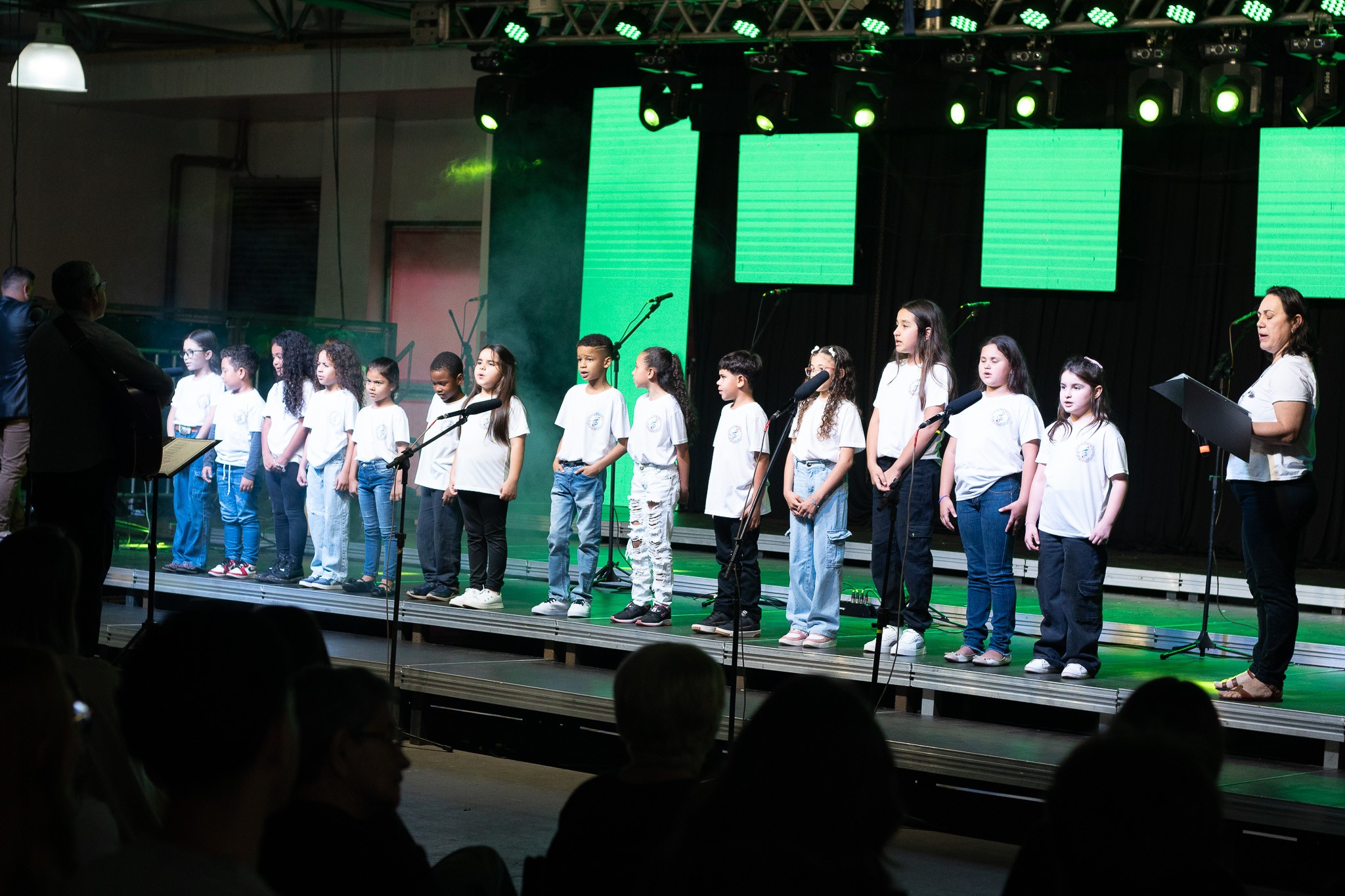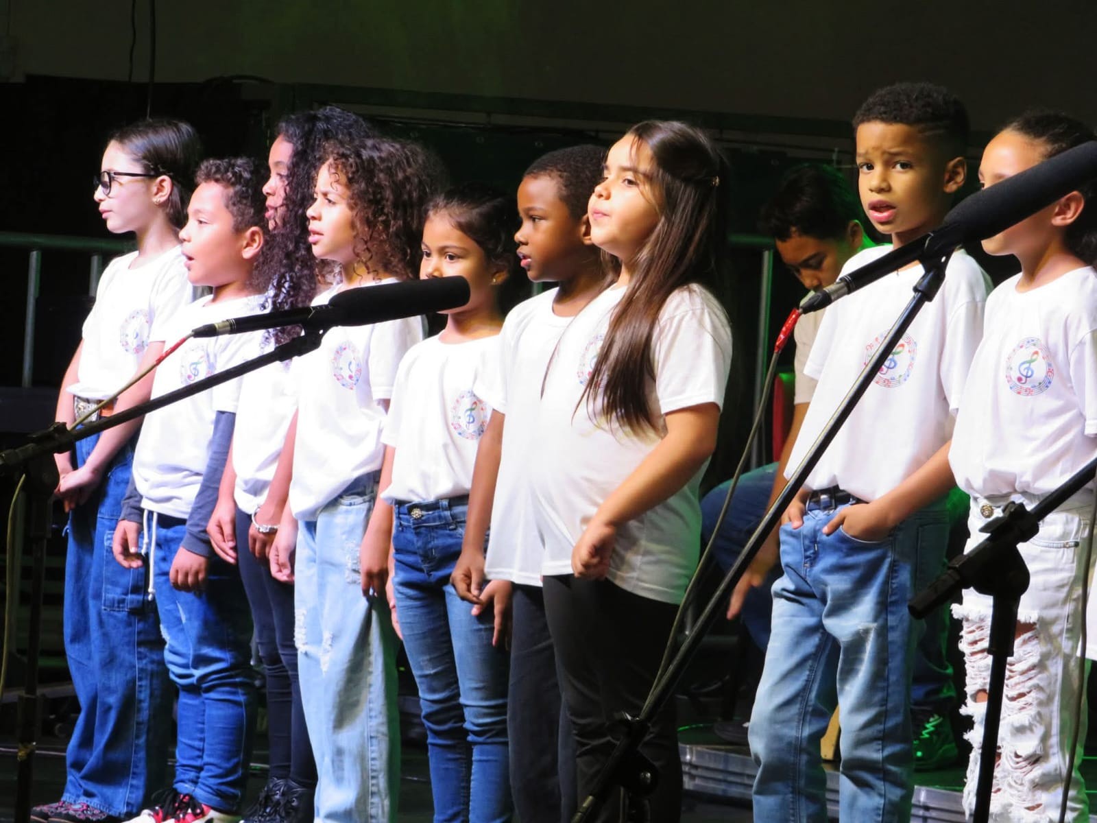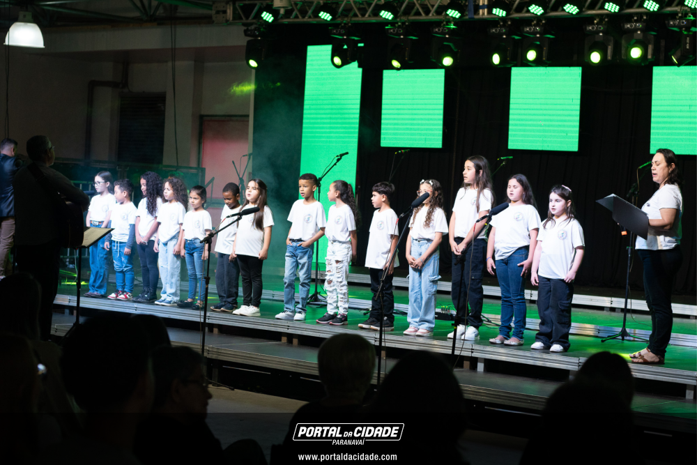 A apresentação foi conduzida pelos instrutores Rogério e Rosângela, responsáveis pelas oficinas musicais, e contou com um repertório emocionante. No palco, as crianças interpretaram as canções “Aquarela”, “De gotinha em gotinha”, “Bênçãos que não têm fim” e “Era uma vez”.